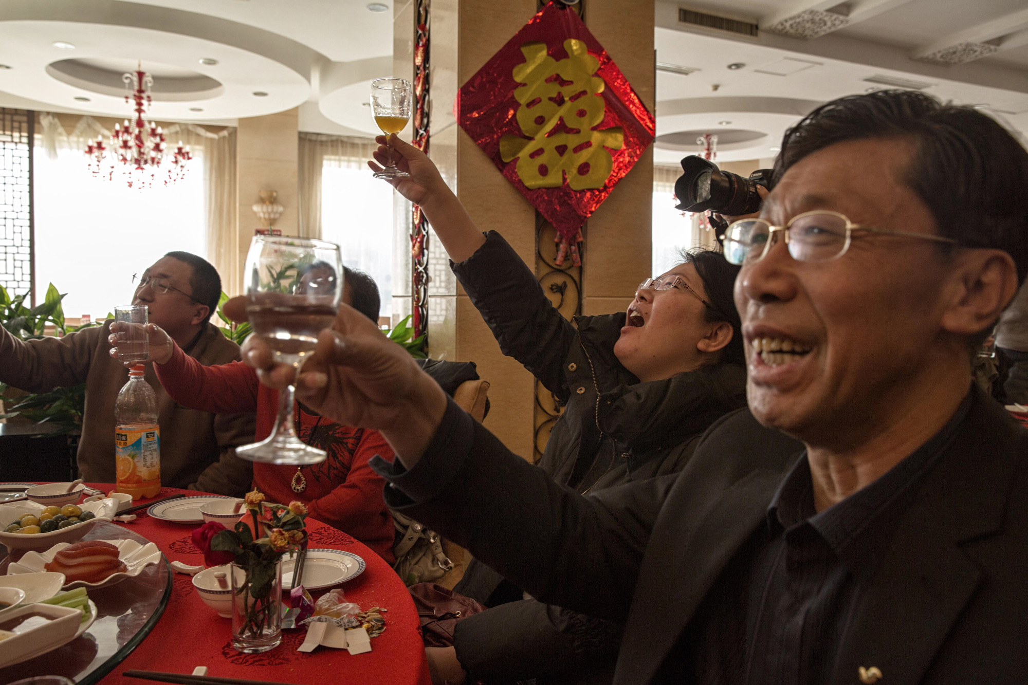 Back at the wedding, all of this is beside the point. Lucy Wang and Derek Wei are planning to register their home in both their names. As a toy tank bearing the couple's rings trundles down the aisle, they drink from a champagne fountain and share a kiss. Their life together is only just starting.