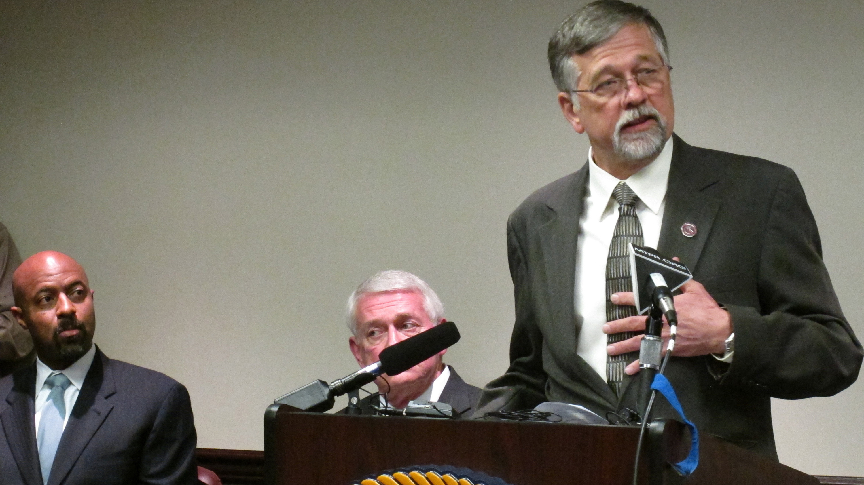 University of Montana President Royce Engstrom, right, discusses the school's effort to reform the way it handles sexual assault cases, as Deputy Assistant Attorney General Roy Austin, left, and U.S. Attorney for Montana Michael Cotter listen. (AP)