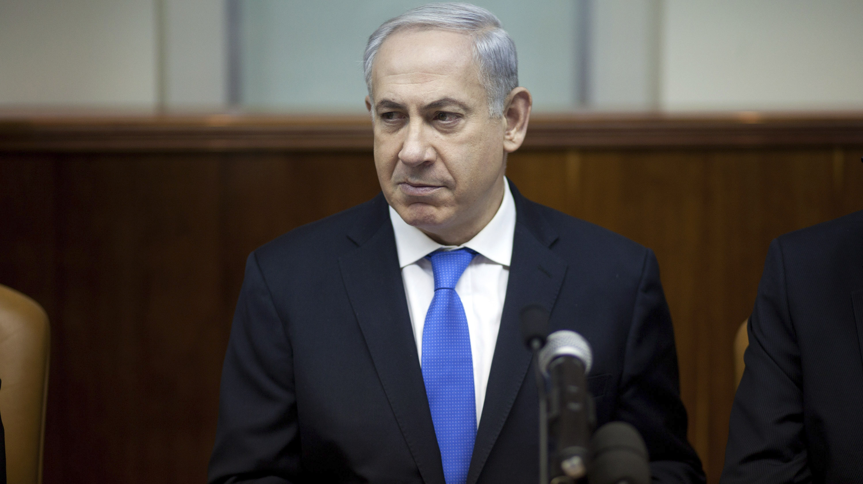 Israeli Prime Minister Benjamin Netanyahu heads the weekly Cabinet meeting in his office in Jerusalem on Monday. He's facing criticism for spending $127,000 of public money to outfit an El Al jet with a double bed plus a wall around it so he and his wife could rest well (and privately) on a flight to London last month. (AP)