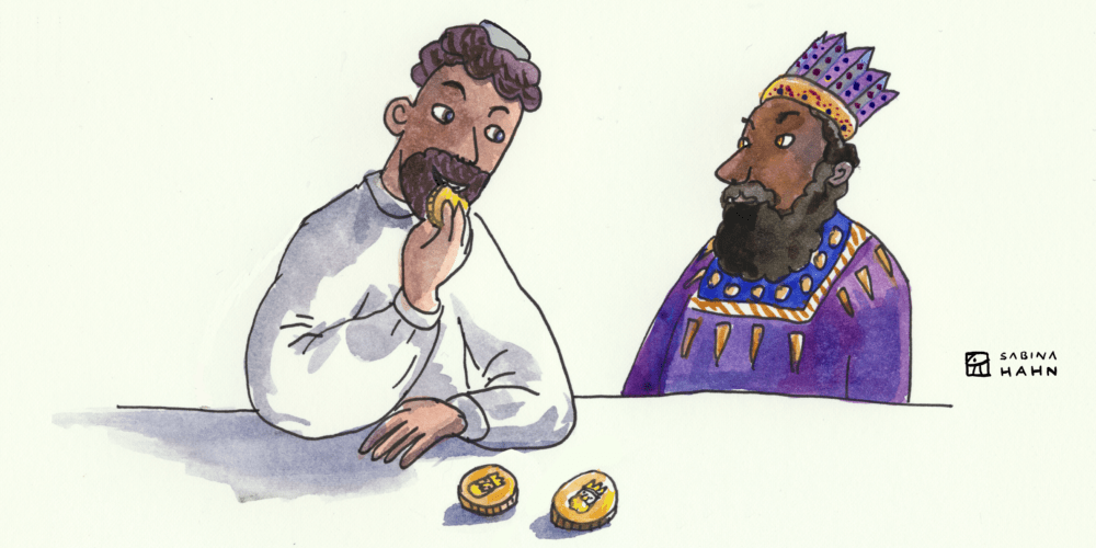 And even though his new royal salary was a wee bit larger than three silver coins, he continued splitting his earnings into three parts: one, he ate. One, he loaned out. And one, he gave back.