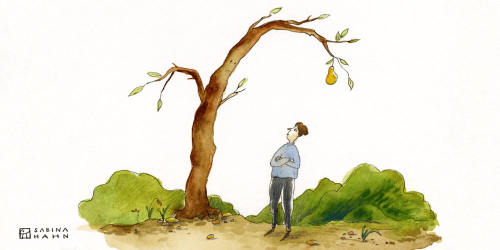 He rode on, and before long, he came across a pear tree in a sunny meadow. The tree’s healthy, well-trimmed branches were exploding with ripe, yellow fruit. Benjamin heard his stomach grumble.