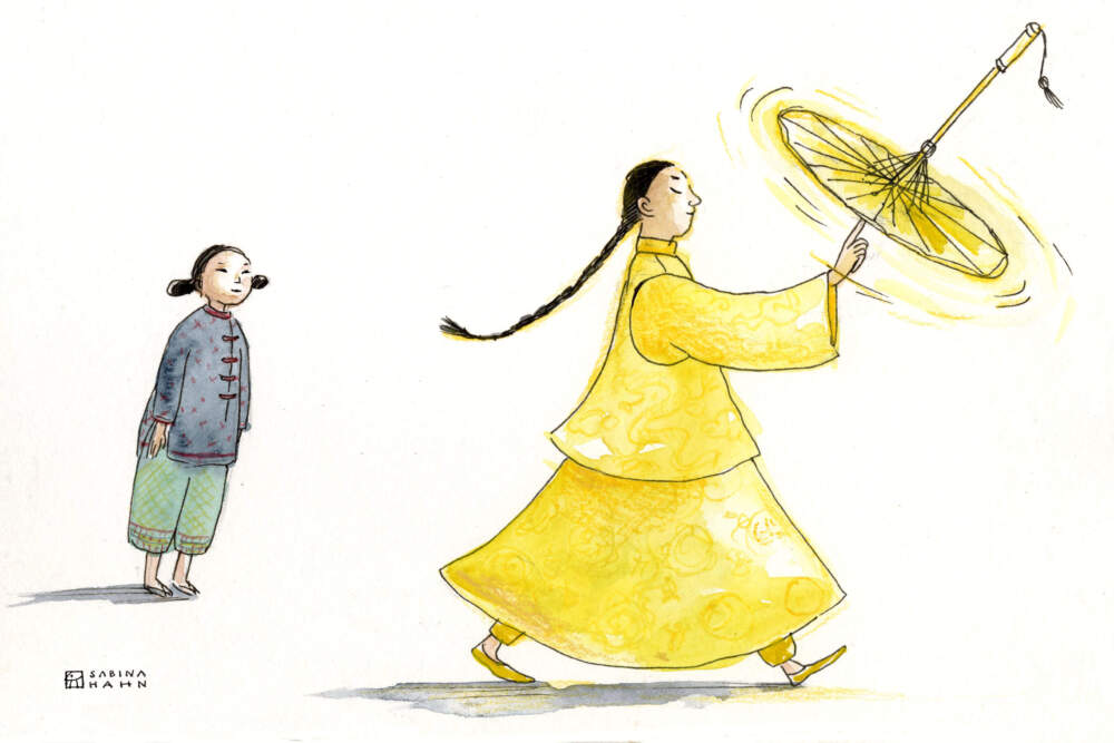 MEI LIEN: (realizing) I suppose he was riding his golden dragon horse! (beat) But… what about the umbrella? The Yellow Dragon was holding a big yellow umbrella! And before he left, when he crossed through our gate, he turned the umbrella upside-down.