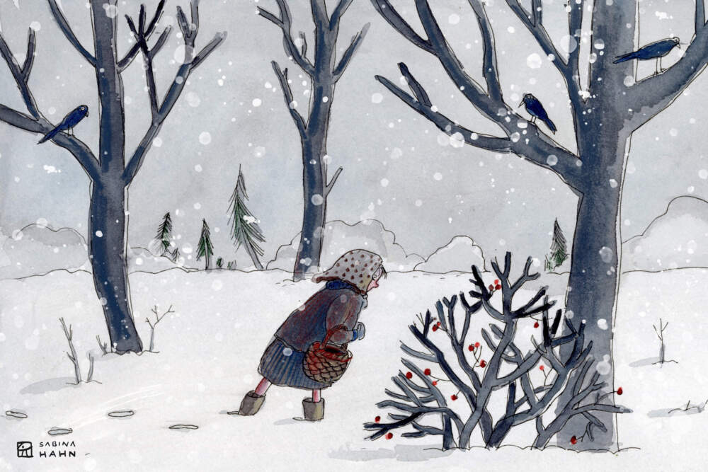 NARRATOR: Gretchen bundled up in her coziest coat, mittens and hat. Then she pulled on her boots, grabbed a basket, and stepped outside.