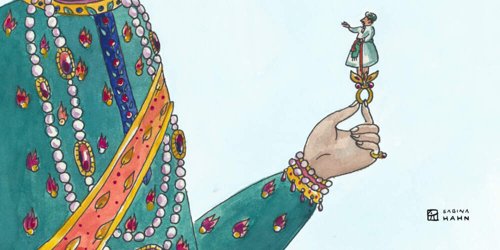 NARRATOR: Thanks to Birbal’s wit and wisdom, by the end of the day the emperor was wearing his thick gold ring set with a dazzling diamond the size of an apricot.