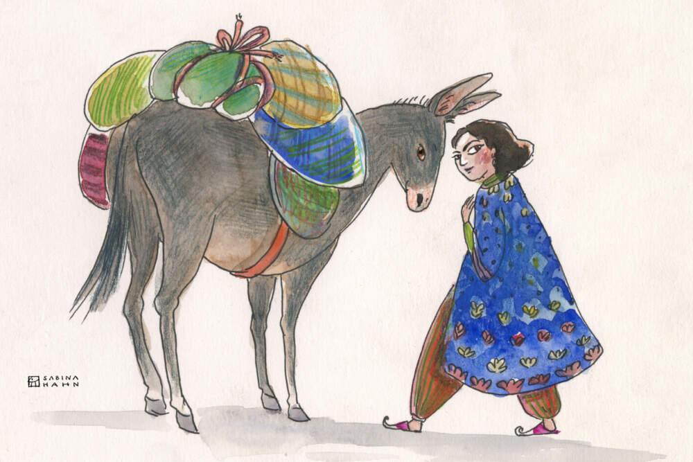 Eventually, a year went by. But even though the routine never changed – Nasruddin showed up with a donkey, the guard conducted another fruitless search – one thing did change. Nasruddin appeared… to grow wealthier! Her clothing got more lavish, and bright, sparkling jewels began to appear around her neck, wrists, and fingers.