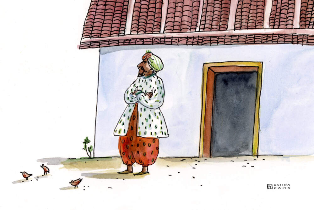 One day, the merchant arrived in a new town. He got himself a room at the inn, then shuffled off to the marketplace, where rows of vendors were hawking silks and spices, fabrics and fruits, trinkets and toys.