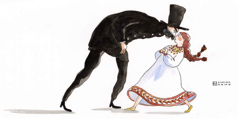 NARRATOR: Slowly, Oleksandra turned her head. Standing behind her was a man dressed all in black. Black jacket, black boots, black cape, black hat. He even had a bushy black mustache.