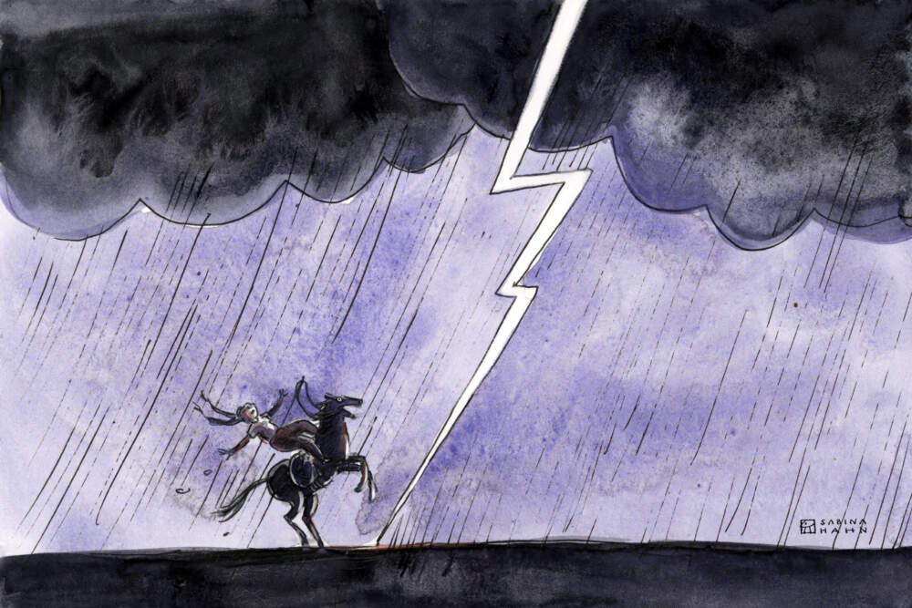 NARRATOR: Raindrops pelted her face as she lay flat on her back, hearing her horse’s hoof beats grow fainter and fainter. By the time she pulled herself to a sitting position, the horse was gone.