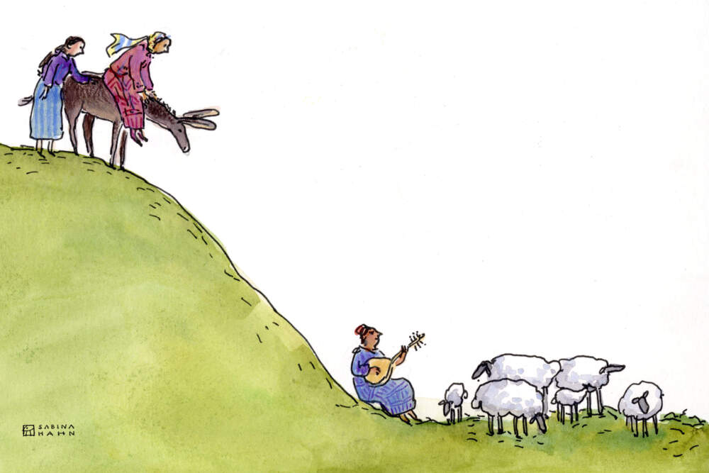 The queen motioned to Zara, and together they trotted down the hillside. When the shepherd heard hoofbeats approaching, he opened his eyes, put down his oud, and stashed it away in a beat-up wooden case.
