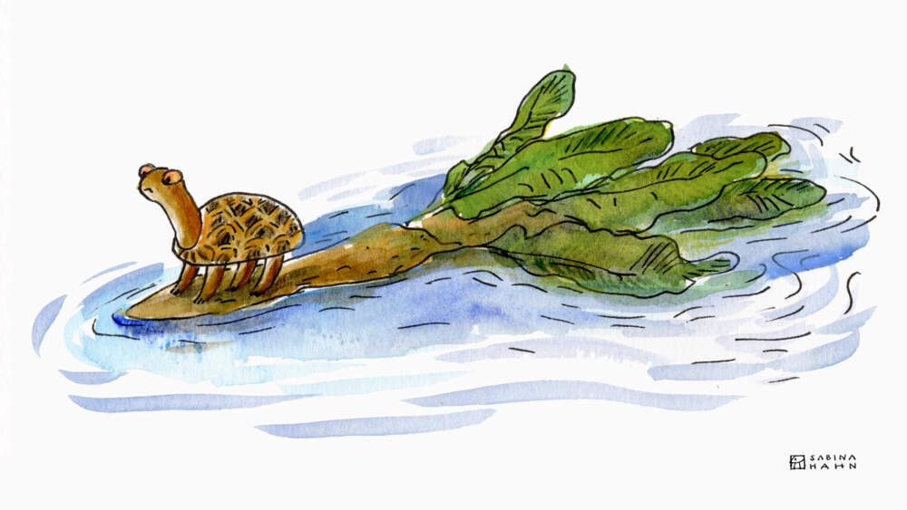 Turtle’s legs may have been slow, but her mind was swift. And as Monkey lounged at the top of the plant, gobbling down one banana after another, Turtle set her nimble mind into motion.