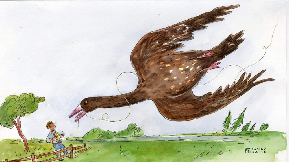 After running for hours, Pavlo finally tracked the goose down in a reedy marsh. It was nighttime, and the goose was sleeping. You may not know this, but geese have excellent hearing – even when they’re snoozing! They stay unusually alert while unconscious. So not long after Pavlo tiptoed over, seized the thread, and scurried away, can you guess what happened?