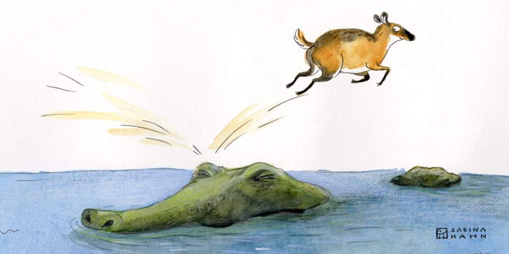 One bright, hot morning, Mouse Deer grabbed a big sack, and pranced over to the river. When she saw Old Crocodile’s spiky, glistening back protruding from the water’s surface, she put a big smile on her face and called out in a friendly voice.