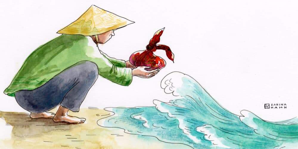 The farmer, meanwhile, was hungrier than ever – but he knew what he had to do. He left the trader and walked to the water’s edge. Then he reached into his knapsack, took out the rice in the scarf, and held it out toward the sea.