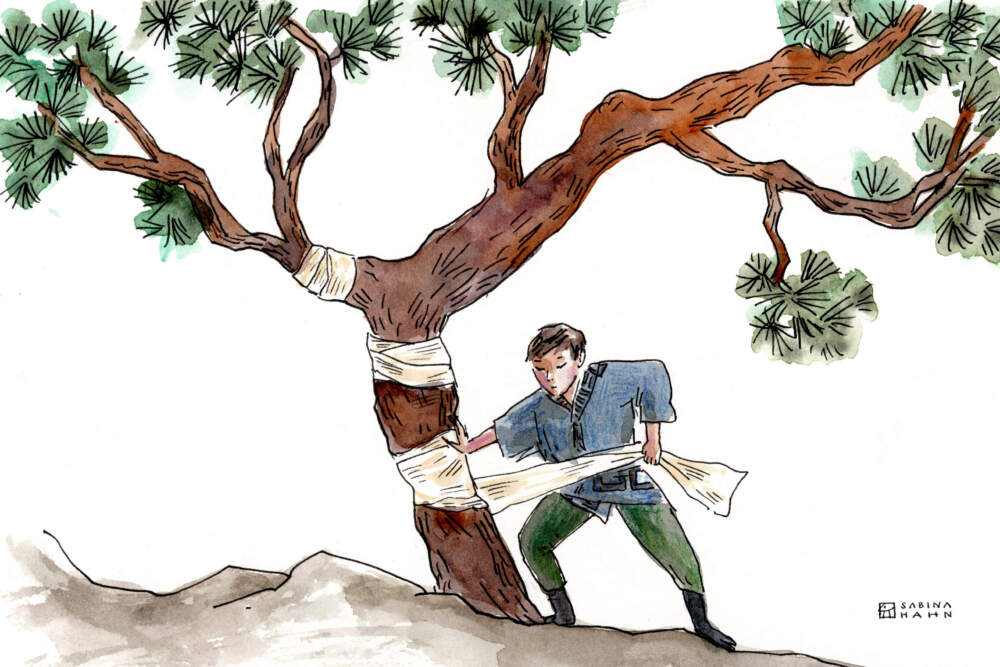 NARRATOR: Without missing a beat, Reo yanked off his jacket, tore off his shirt, and began ripping them into strips! Long, thin strips – like bandages! Carefully and quickly, he wrapped the bandages around the tree’s oozing trunk, and held them gently in place.
