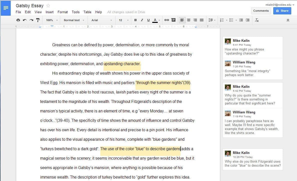 Onto the composition process, where Google Doc’s sharing function changes the nature of communication between teacher and student. Because each of my students writes a draft of their essay using a Google Doc that is shared with me, I can immediately reply to questions that students pose in the margins of their document, rather than waiting until students bring a printed copy to class a few days later. I can also intervene if I notice that a student begins an essay with something like, "In 'The Great Gatsby,' the plot is crucial to the novel, as it both impacts the beginning of the story and leads to its denooment[sic]." No need to make this poor kid spend hours writing a draft that will read like a Harvard Lampoon spoof. Sharing documents also increases student accountability for meeting deadlines, an advantage not to be dismissed, especially for younger students still learning time management skills.