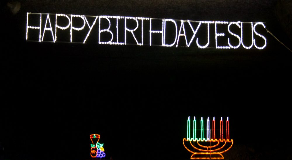 That’s why I don’t care whether public trees are called Christmas trees, despite the absence of evergreens from the Nativity story. And it’s why I cringe when I see those public menorahs, and when I hear references to “Christmas-and-Hanukkah,” as though it were one word.