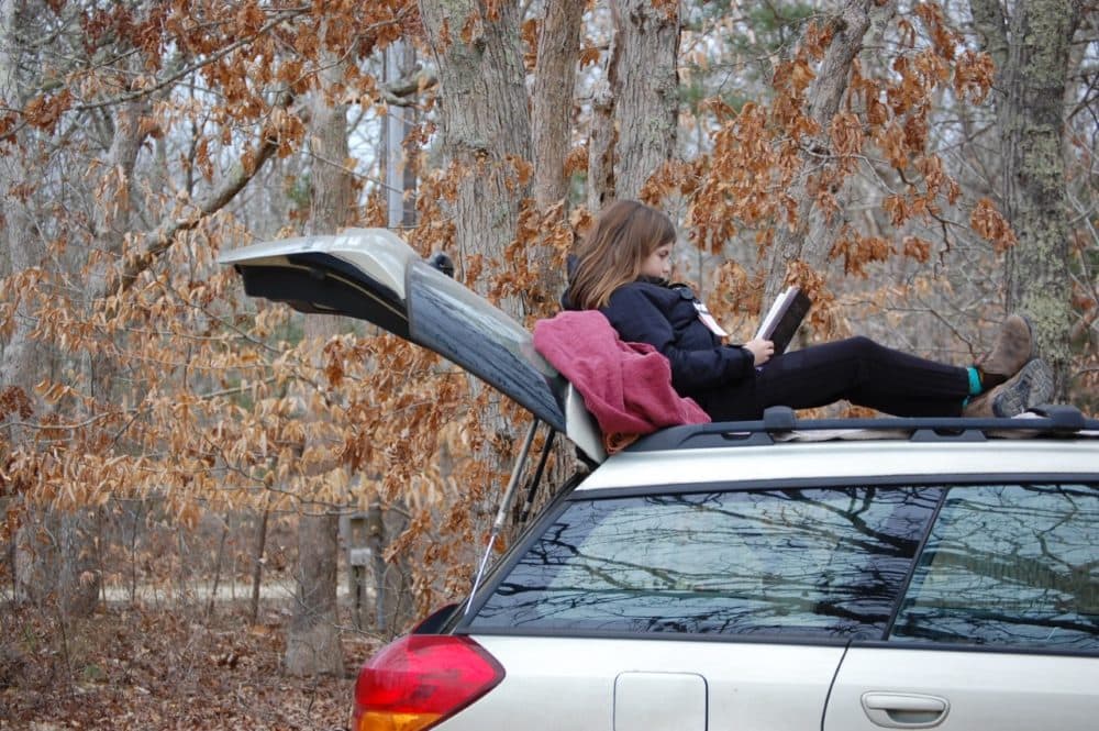 That evening, I make a plan with Hardy to watch a movie. Pickle is not happy with this and keeps asking why she can’t join. I spend so much of each day with Pickle, giving precedence to the needs of an extroverted 12-year-old, but I know Hardy needs me, too, even if he is not vocal about this. I get frustrated with Pickle’s whining and snap at her. She storms outside, taking a book, blanket and pillow with her. I watch from the window as she climbs onto the roof of the car and builds a reading nook, complete with the raised hatchback for a backrest.