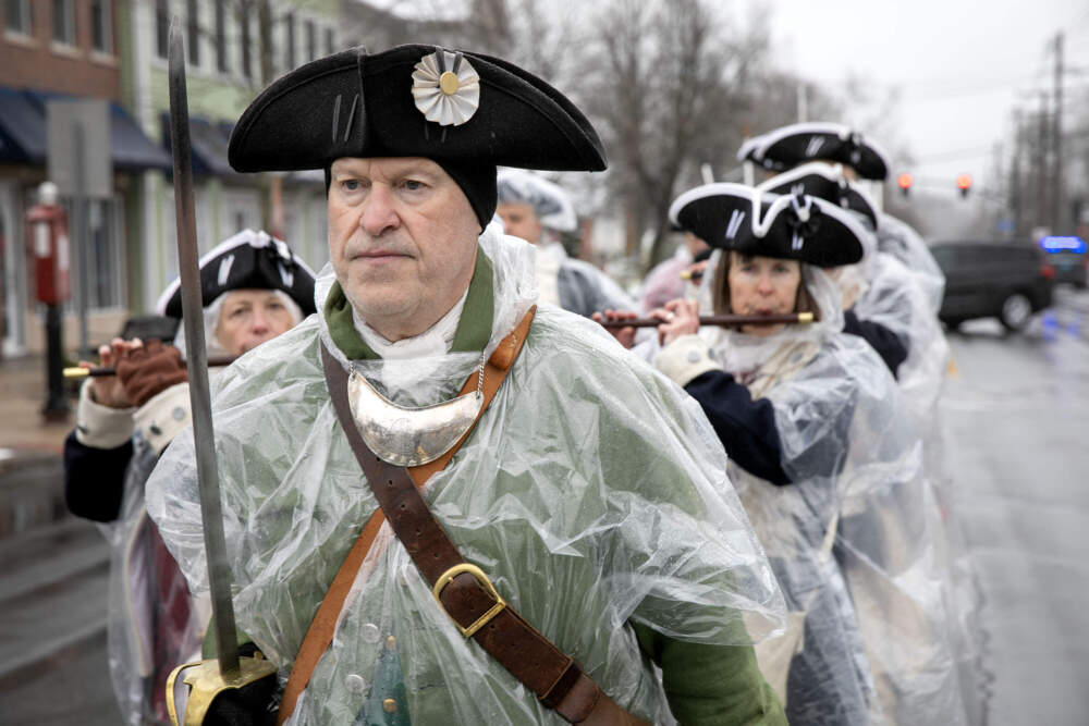 Scott Evans, the group’s fife sergeant, put the music corps through its paces. They marched, slowly, solemnly, past the Minute Man statue, sculpted by Daniel Chester French, across the Old North Bridge, along a paved path up a grassy hill to Buttrick House and back again. As its captain, Sweeney led the group, sword raised in his left hand.