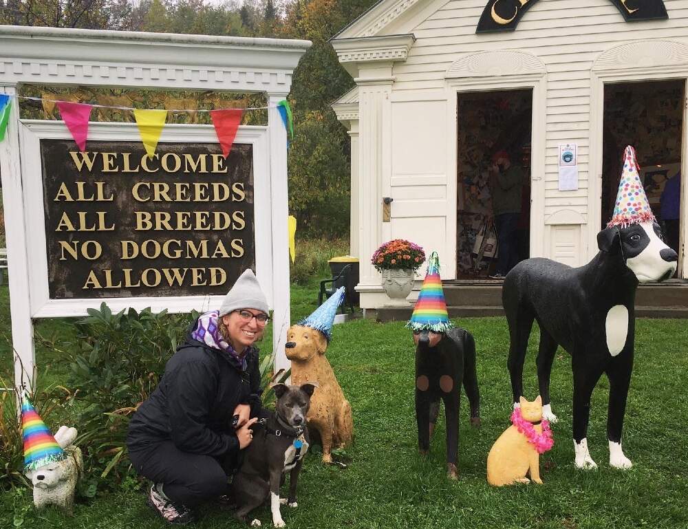 Almost one year to the day we adopted Seymour, the three of us — Richie, Seymour, and I — drove to St. Johnsbury, Vermont, to visit Dog Mountain, a sprawling 150-acre canine paradise founded by folk artist Stephen Huneck. In addition to winding trails and ponds for swimming, there’s a little white Dog Chapel, where people leave tributes to their dead dogs. That crisp fall day happened to be one of Dog Mountain’s seasonal Dog Parties — there were food trucks, farm stands, live music and dozens of people and their dogs. Maybe due to some sort of Dog Mountain magic, our usually reactive Seymour was mostly calm and well-behaved as we walked the grounds and brought him into the Dog Chapel to be blessed by an Episcopal priest in honor of the Feast of St. Francis, patron saint of animals.