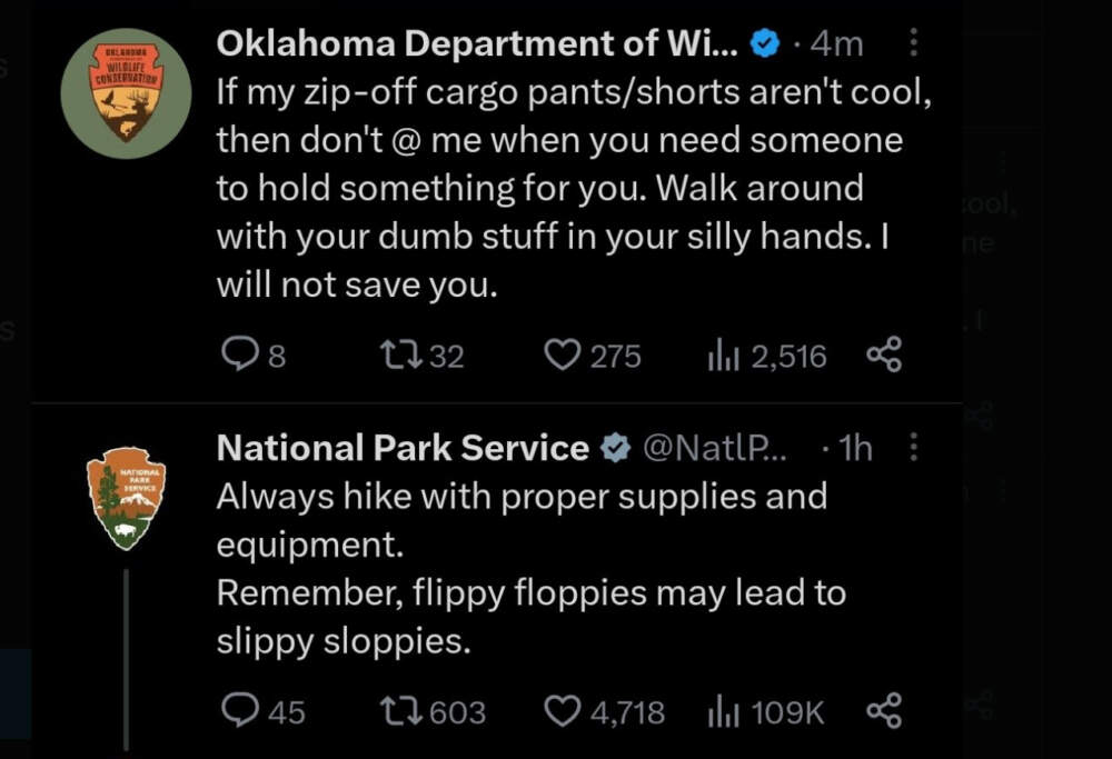 Amory: Whether you learn something every time you scroll through the National Park Service and the Oklahoma Department of Wildlife Conservation’s social media pages, or you just come for the lolz and stay for the post that makes you FEEL like you're going outside, touching grass...