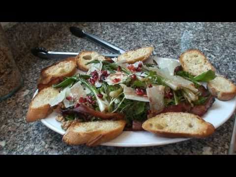 ____Kathy Gunst’s New Years Bistro-Style Salad with Poached Egg, Parmesan Shavings, Pancetta, Sautéed Scallions, Toasted Walnuts, and Cheese Toasts with Pomegranate-Lemon Dressing____