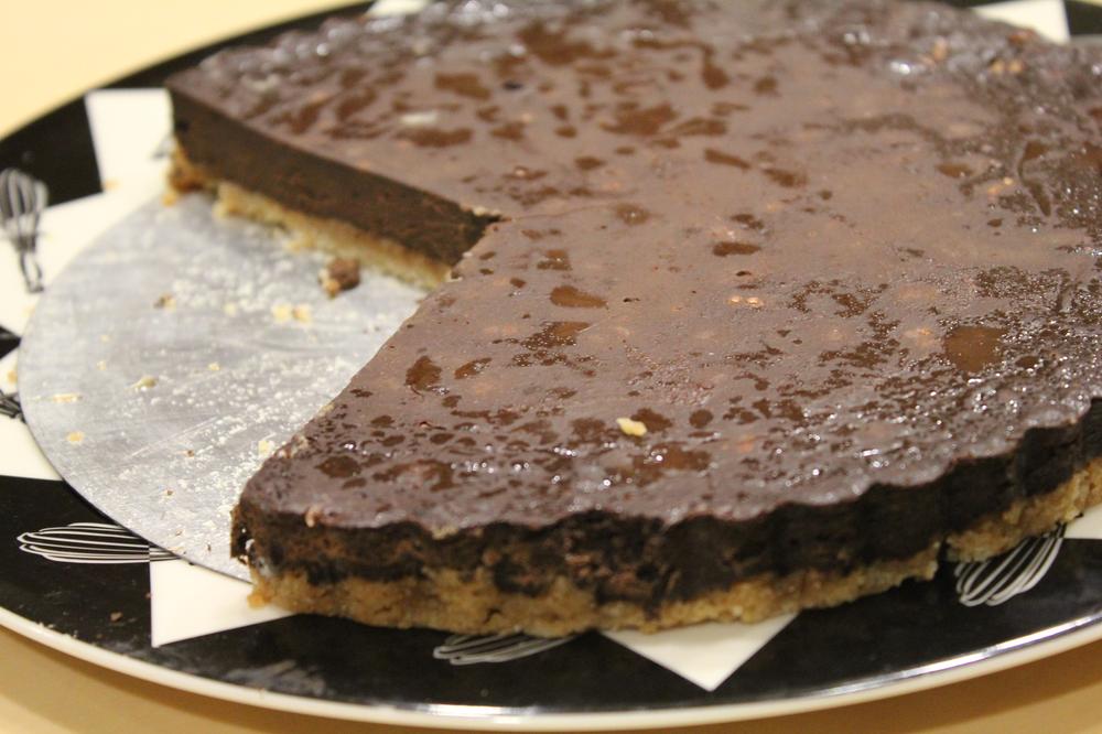 In a separate bowl whisk the eggs, vanilla, and 1/2 teaspoon of sea salt until frothy. Add the whisked egg mixture to the chocolate mixture. Pour the filling into the cooled crust and bake on the middle shelf for about 25 to 28 minutes. To test for doneness: gently shake the tart and if the middle wobbles a little (and still appears undercooked) but the sides seems solid it is perfect. The tart will continue to cook when it’s removed from the oven and will firm up while cooling.