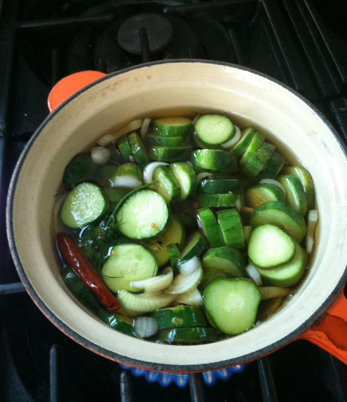 Boil the vinegar, water, mustard and coriander seeds, chile, and sugar over high heat. Add the cucumber and onions and cook 2 minutes. Add the vegetables to a quart jar or 2 pint size jars and add the dill to glass jar. Let cool and seal. Refrigerate for up to several months. Makes one quart jar of pickles.