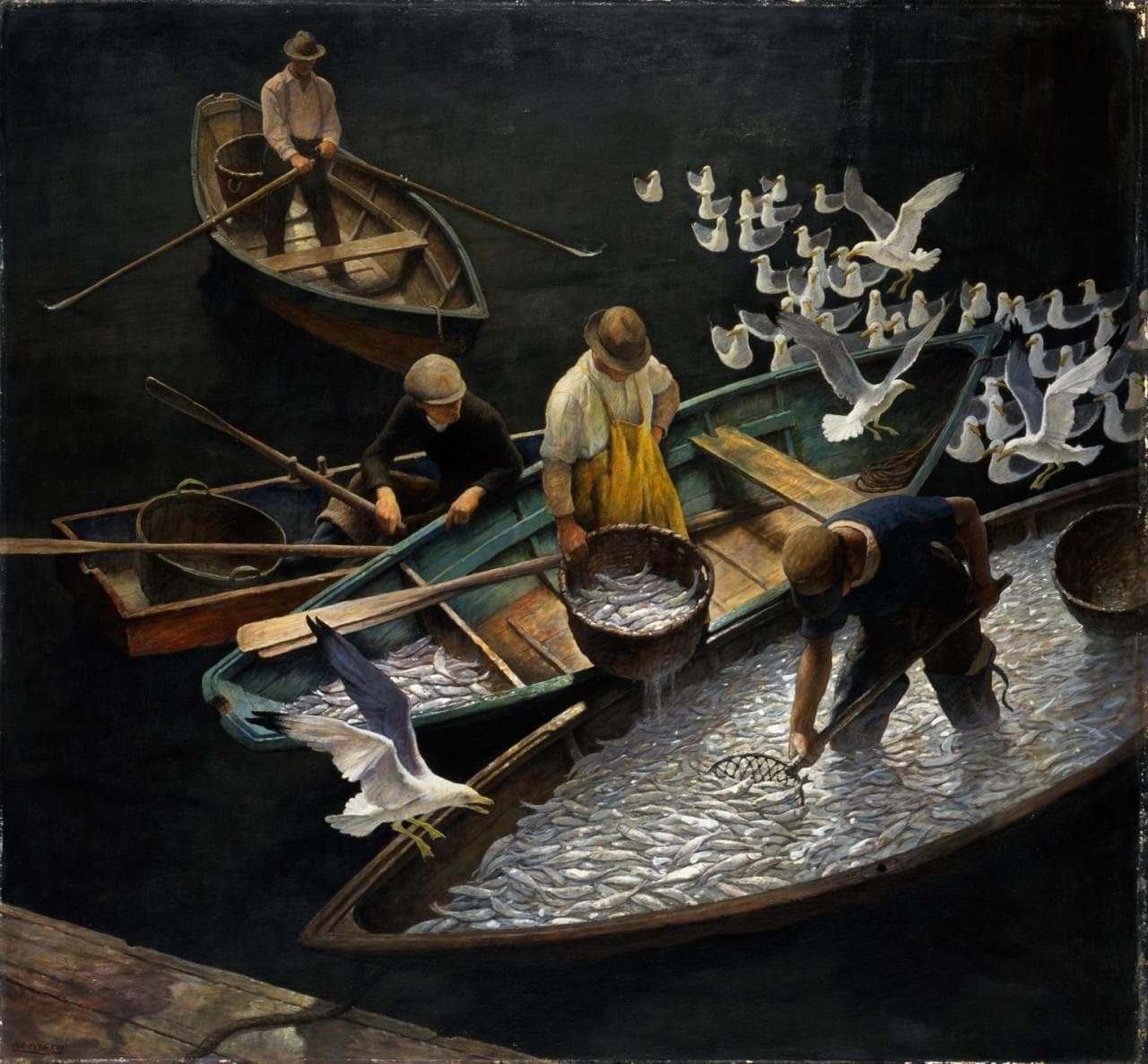 In Dark Harbor Fishermen, N. C. Wyeth invites the viewer to look down on a dory brimming with bait fish as if standing on a dock. Three other boats provide an edgy geometric frame while a flock of gulls wheeling in flight activate and agitate the scene. Wyeth, one of the nation’s foremost illustrators, well knew how to capture the eye and tell a timeless story — in this case, the age-old narrative of taking sustenance from the sea.