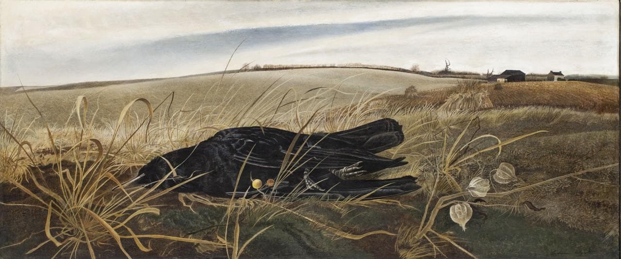 Andrew Wyeth discovered a dead crow behind his father’s Chadds Ford studio and immediately recognized the power of the image. The coal black bird is in stark contrast to the spectrum of earth tones that make up the Pennsylvania countryside and Winter Fields is painted from a worm’s eye view that requires the visitor to simultaneously look down upon the dead crow while looking uphill toward a farm on the ridge. Use of this disconcerting perspective reinforces the authority of an uncomfortable image of the last stage in the voyage of life.
