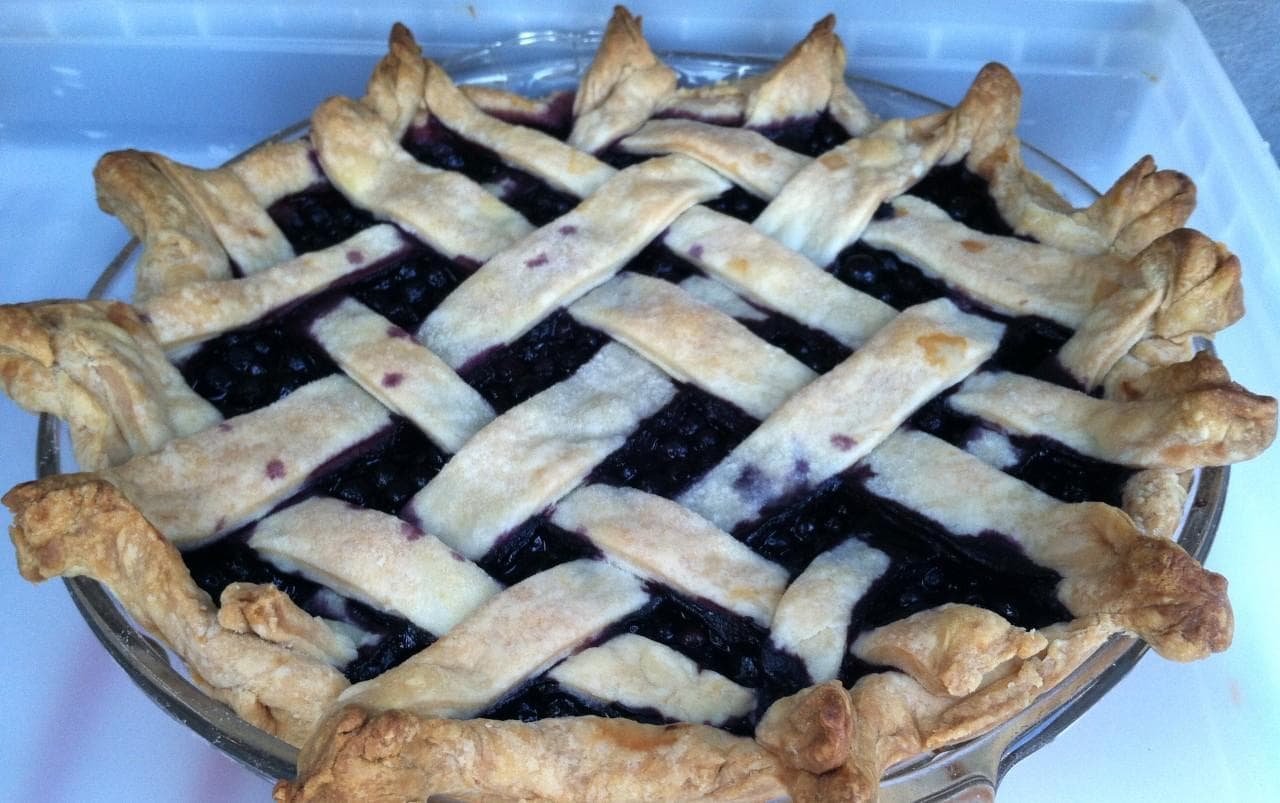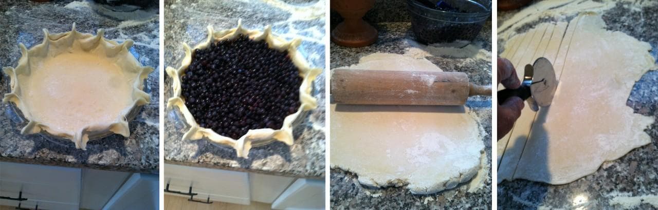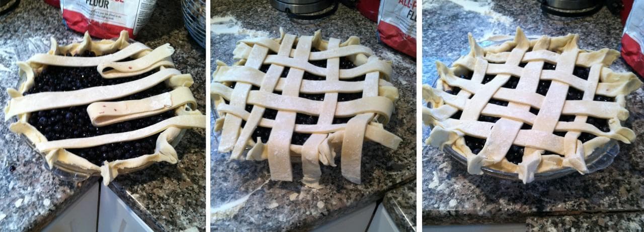 Sprinkle a clean work surface with flour. Remove one of the chilled dough circles and roll it out to a circle about 11 inches across. Place the circle into a 9-inch pie plate, allowing the edges to fall over the sides of the pie plate. Place the blueberry mixture inside the dough. Roll out the other piece of dough to a circle about 11 inches across. Using a pizza cutter or a small, sharp knife, cut strips about 1/2-inch thick out of the dough. Place the strips on top of the fruit filling, creating a criss-cross lattice pattern. Trim off any excess crust and crimp the edges of the dough together, creating a decorative pattern.