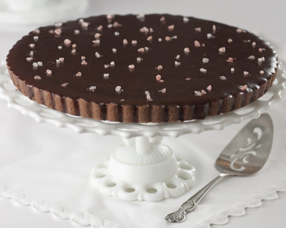 - Pour the chocolate filling over the almond cream. Pop any surface bubbles with a toothpick. Let sit for 15 minutes, then dust the top of the tart with a sprinkling of pink salt. Let the tart set, about 1 hour.