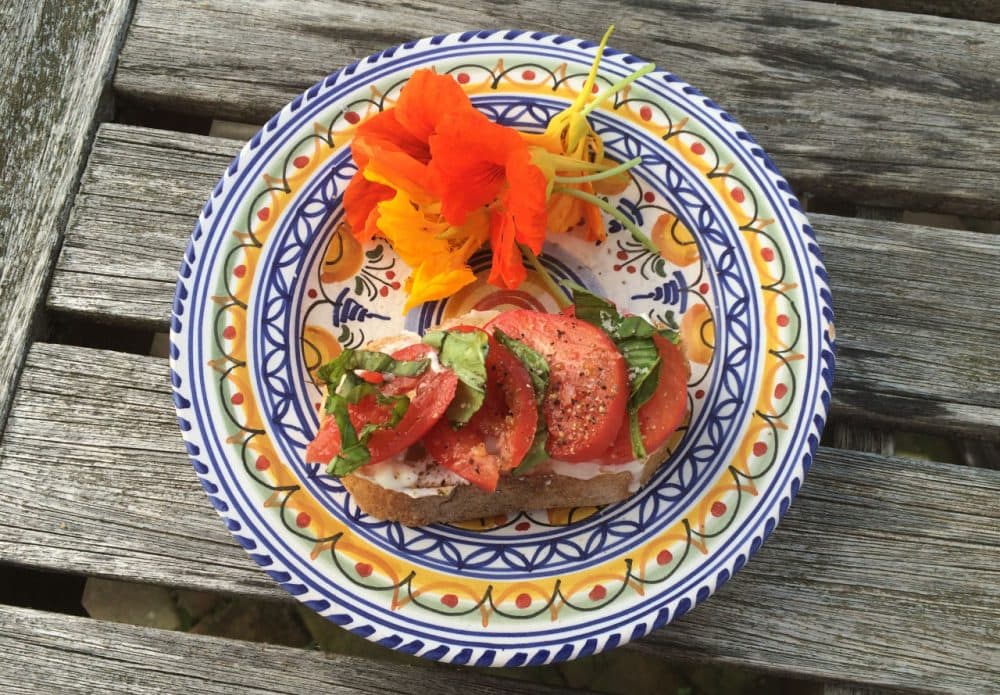 Kathy’s Note: This French-style open-faced sandwich features ripe seasonal tomatoes, fresh basil and fresh ricotta or goat cheese with a sprinkling of salt, pepper and olive oil. You could always add thin slices of peeled cucumber or avocado as well.