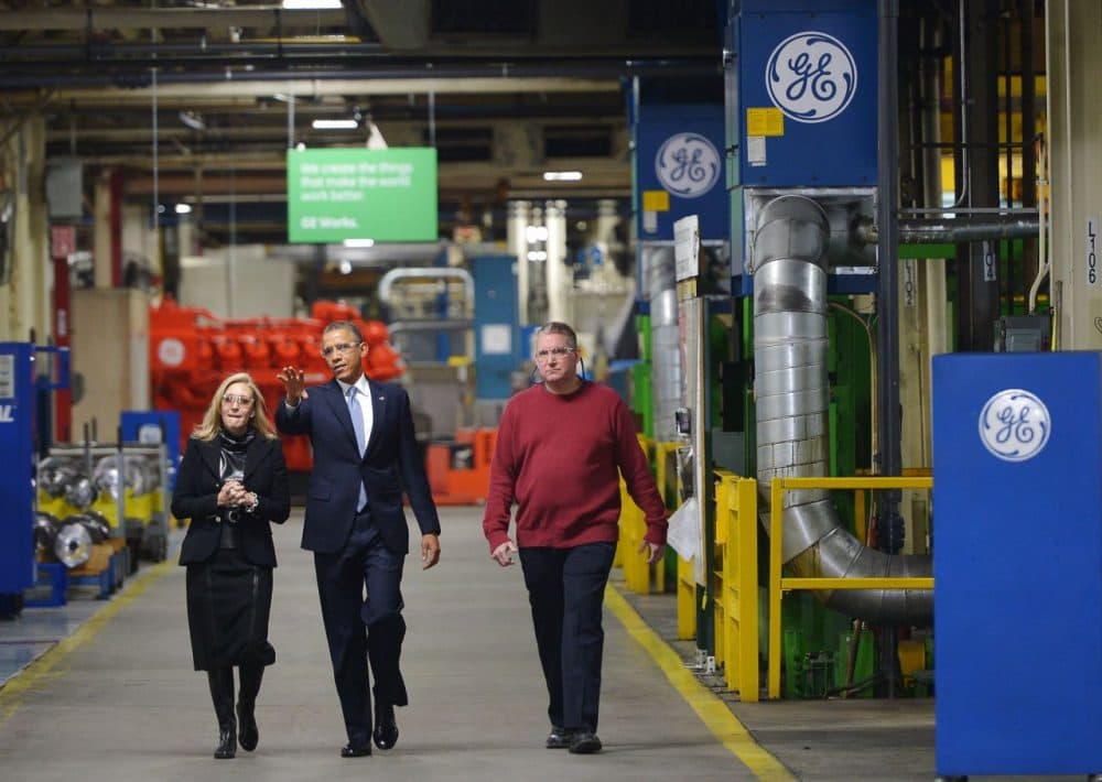 President Barack Obama toured the General Electric Waukesha Gas Engines facility in 2014 in Waukesha, Wisconsin. The company has just announced they will pull over 300 manufacturing jobs at the Waukesha facility. (Mandel Ngan/AFP/Getty Images)