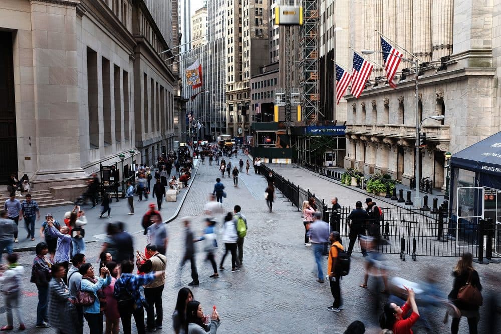People walk outside of the New York Stock Exchange through Manhattan's financial district on Sept. 29, 2017 in New York City. According to a recent report, America's largest banks could see profits rise by $6.4 billion under Trump's tax plan. (Spencer Platt/Getty Images)