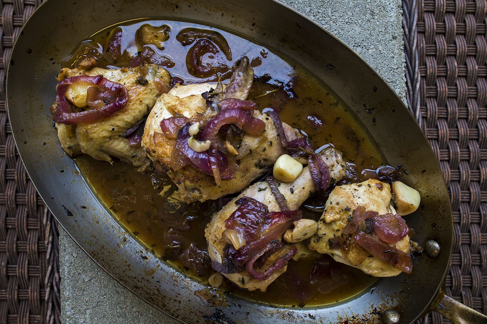 - In the same skillet add the remaining oil and 1 teaspoon of the butter and raise the temperature to moderately high. Brown the chicken pieces, seasoned with salt and pepper, about four minutes per side. Remove some of the fat from the bottom of the skillet but not all — make sure there is at least 1 tablespoon left. Make sure the chicken is skin side up and add the cooked onions and garlic back into the skillet, and then splash in the vinegar and the 1 tablespoon of water. Bring to a simmer.