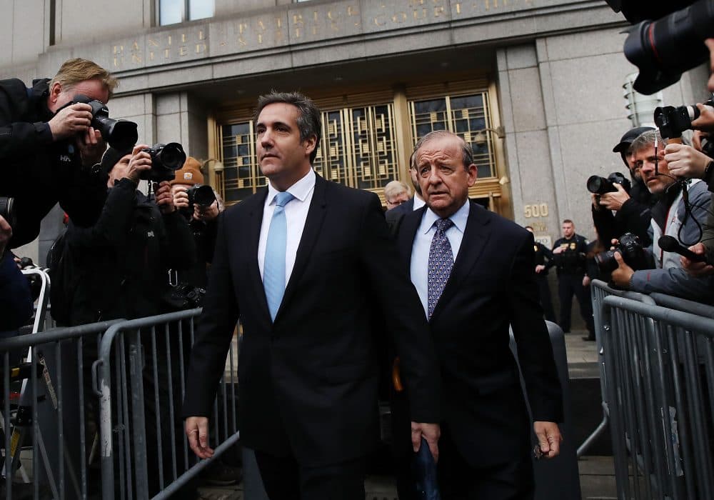 President Trump's longtime personal attorney Michael Cohen (left) exits a New York court on April 16, 2018 in New York City. Trump's lawyers asked a federal judge to temporarily block prosecutors from reviewing files seized by the FBI from Cohen's offices and hotel room earlier this month. Trump's lawyers have argued that many of the documents are protected by attorney-client privilege. (Spencer Platt/Getty Images)