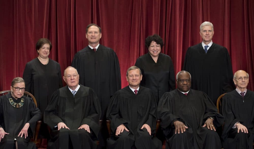 Seated (L-R): Associate Justices Ruth Bader Ginsburg and Anthony M. Kennedy, Chief Justice of the US John G. Roberts, Associate Justices Clarence Thomas and Stephen Breyer. Standing (L-R): Associate Justices Elena Kagan, Samuel Alito Jr., Sonia Sotomayor and Neil Gorsuch. (Saul Loeb/AFP/Getty Images)