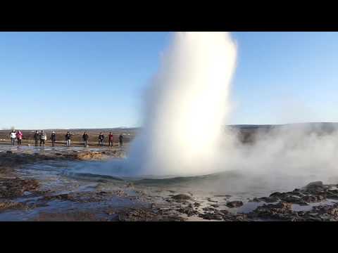 At the Strokkur Geyser, tourists gather around and watch as the plume of water erupts sometimes 65 feet into the air. There are signs warning people to stay off muddy embankments and away from the boiling water.