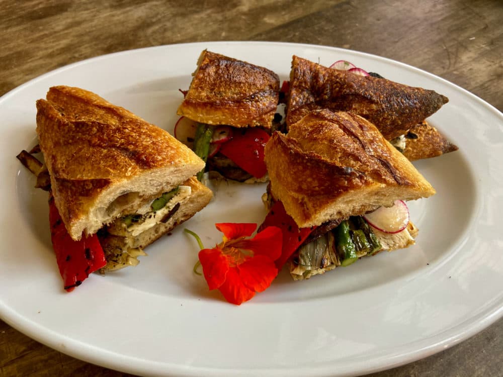 - To assemble the sandwich: Layer the cheese on one piece of the bread (the bottom half of the baguette). Place the asparagus, leeks, eggplant, mushrooms and peppers on top. Top with the radishes. Drizzle the balsamic vinegar on the other (top) half of the sandwich, and place the two halves together pressing down gently. Carefully cut into 4 sandwiches.