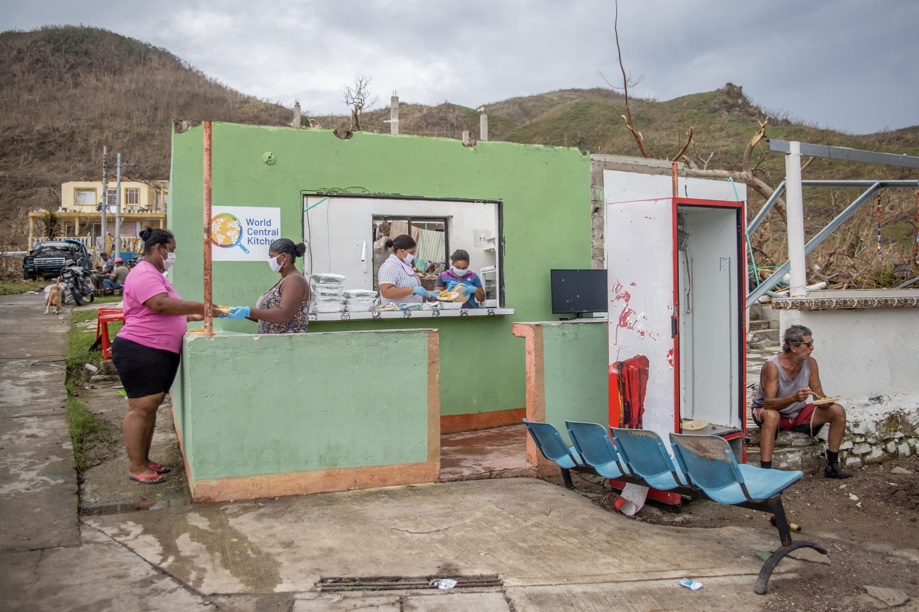 World Central Kitchen volunteers prepare food inside building that lost its roof to a hurricane. (National Geographic/Clara Wetzel)