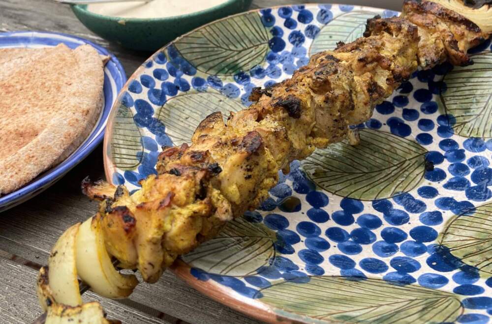 The chicken should marinate for several hours or overnight, but not for any longer, and is then tightly placed on skewers. You can use wooden skewers (which must be soaked in cold water for an hour to prevent burning) or longer metal skewers, but the meat is pressed down so it's touching and compact. The grilled chicken is served with warm pita bread, tahini sauce and tomato-cucumber-cilantro salad.