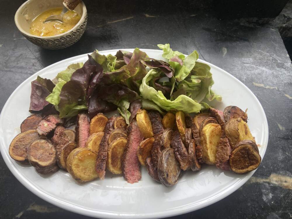 The first recipe is a redo of steak and potatoes. A thick steak is grilled or pan-fried, sliced, and served with thick slices of crispy potatoes on top of a bed of seasonal lettuce, arugula or greens. A mustardy shallot vinaigrette is spooned on top. It’s satisfying, but also a bit lighter than the standard steak and potato dinner.