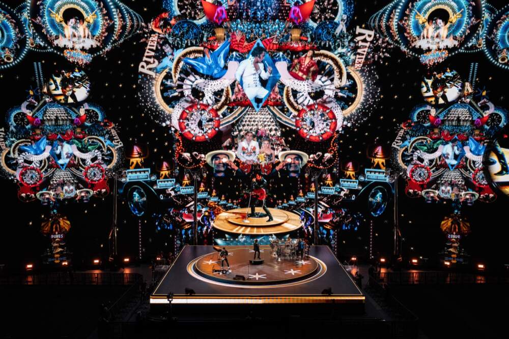Another key moment for visuals in the show comes with the song “Even Better Than The Real Thing.” The song will become an ode to Las Vegas in a 16K x 16K video projection piece by the artist Marco Brambilla called “King Size,” featuring AI-generated images of — who else — Elvis Presley.