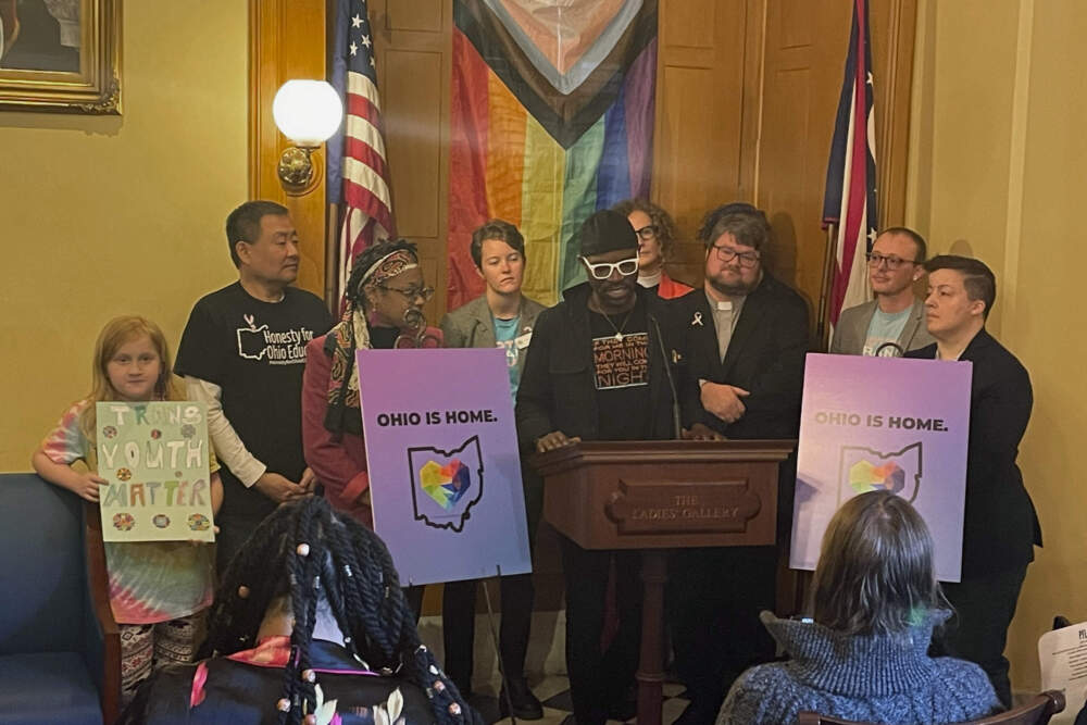 Organizers including clergy, business owners, social workers and transgender individuals gather in the Ohio Statehouse for a press conference on Wednesday, Dec. 13, 2023 in Columbus, Ohio in opposition to a bill that would ban gender affirming care for minors and ban transgender athletes from participating in girls' and women's sports. (Samantha Hendrickson/AP)