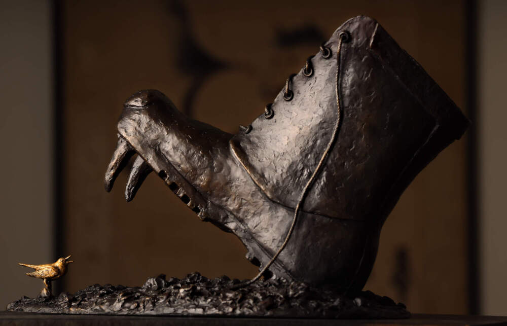 The powerful new sculpture shows an oversized military boot — its toe transformed into a bear face with fangs — about to descend on a tiny nightingale, the state bird of Ukraine. The bird stands atop a tear-shaped pool of rubble. Inside the boot is a hammer and sickle.