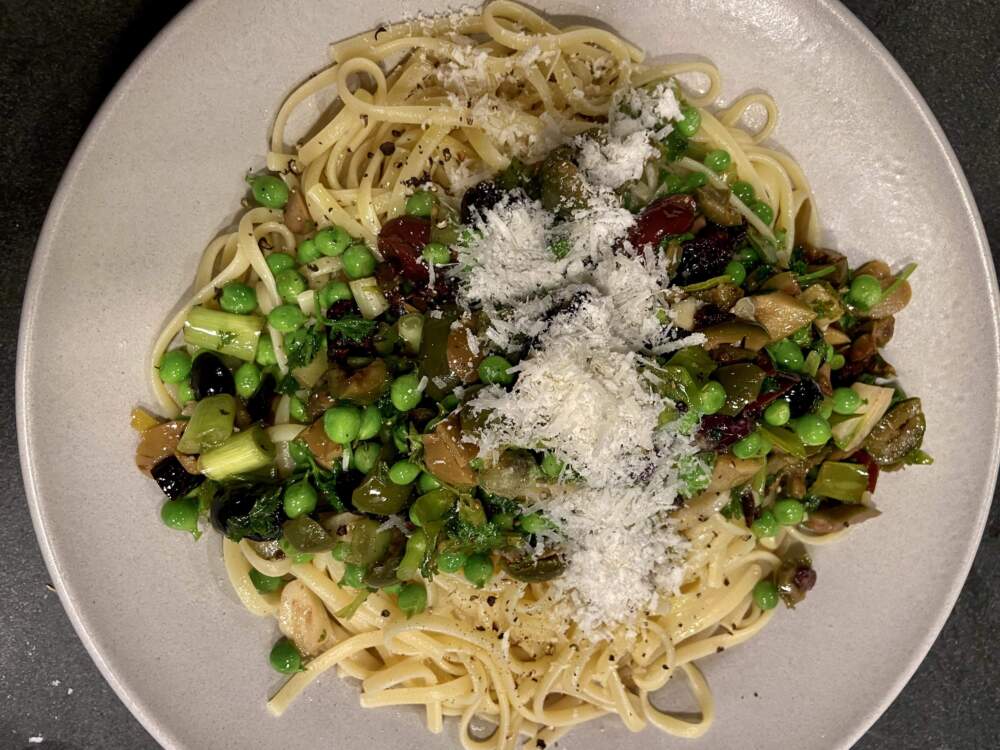 This sauce comes together in the time it takes to boil pasta. I used a mixture of olives — black oil cured, green Castelvetrano, Kalamata, and green Cerignola. Use the best olives you can find and mix it up with green and black varieties. Look for fresh English peas or if it’s not yet pea season in your area, use high-quality frozen peas.