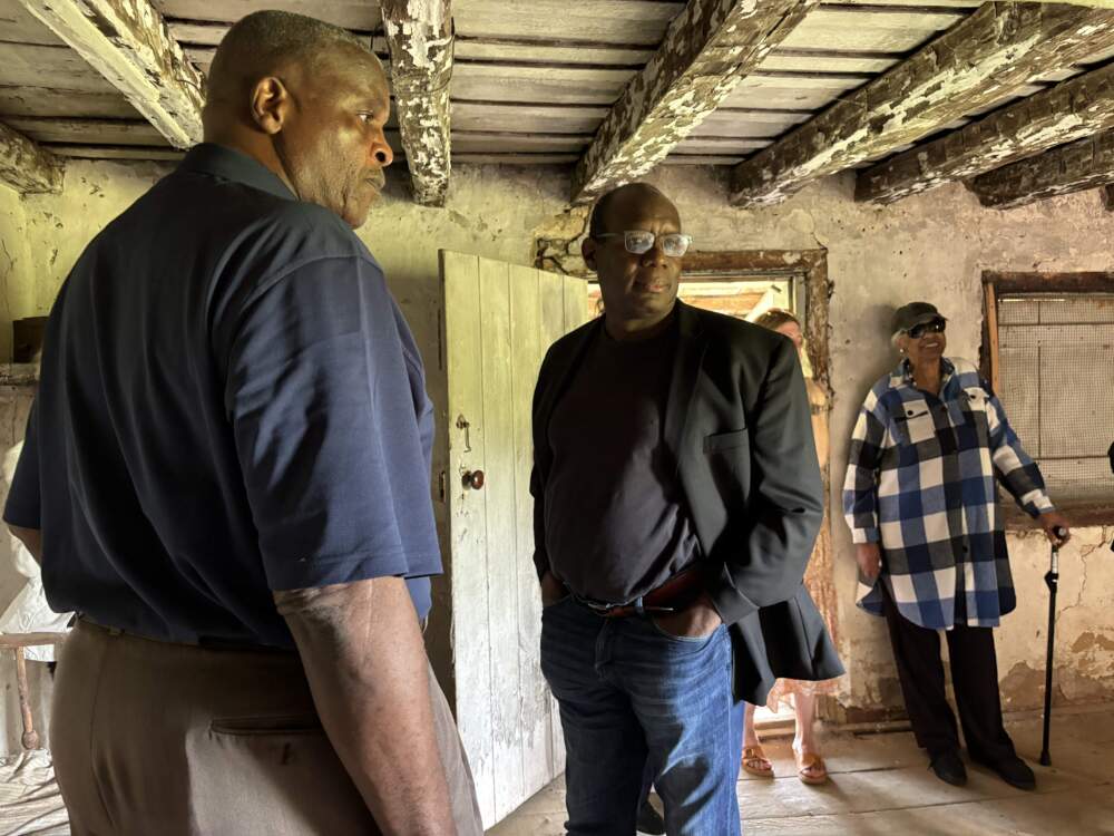 Inside the standing house, Brown says she found out two years ago that enslaved people lived there, even though her mother worked in the main house next door. She doesn't yet have the words to describe standing in this small, cramped space, with its huge fireplace, brick walls, wide wood plank floors, and wood beam ceilings that the tallest among us barely clear.