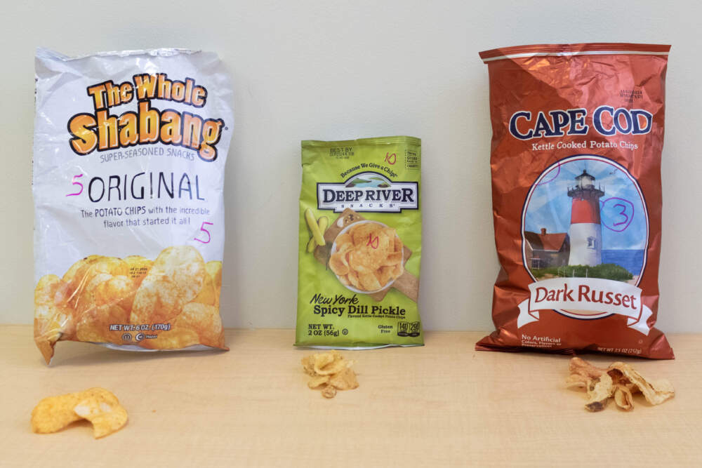 In order to find an ideal potato chip, I decided to hold a potato chip tasting at WBUR’s headquarters in Boston, Massachusetts, the home of Here & Now. To narrow down the field, I tasted close to 40 potato chips with a group of friends at home (and you thought being a food writer was all fun and games!). I then selected the top 10 varieties of chips — both plain and flavored chips — from across the country to bring to the station.