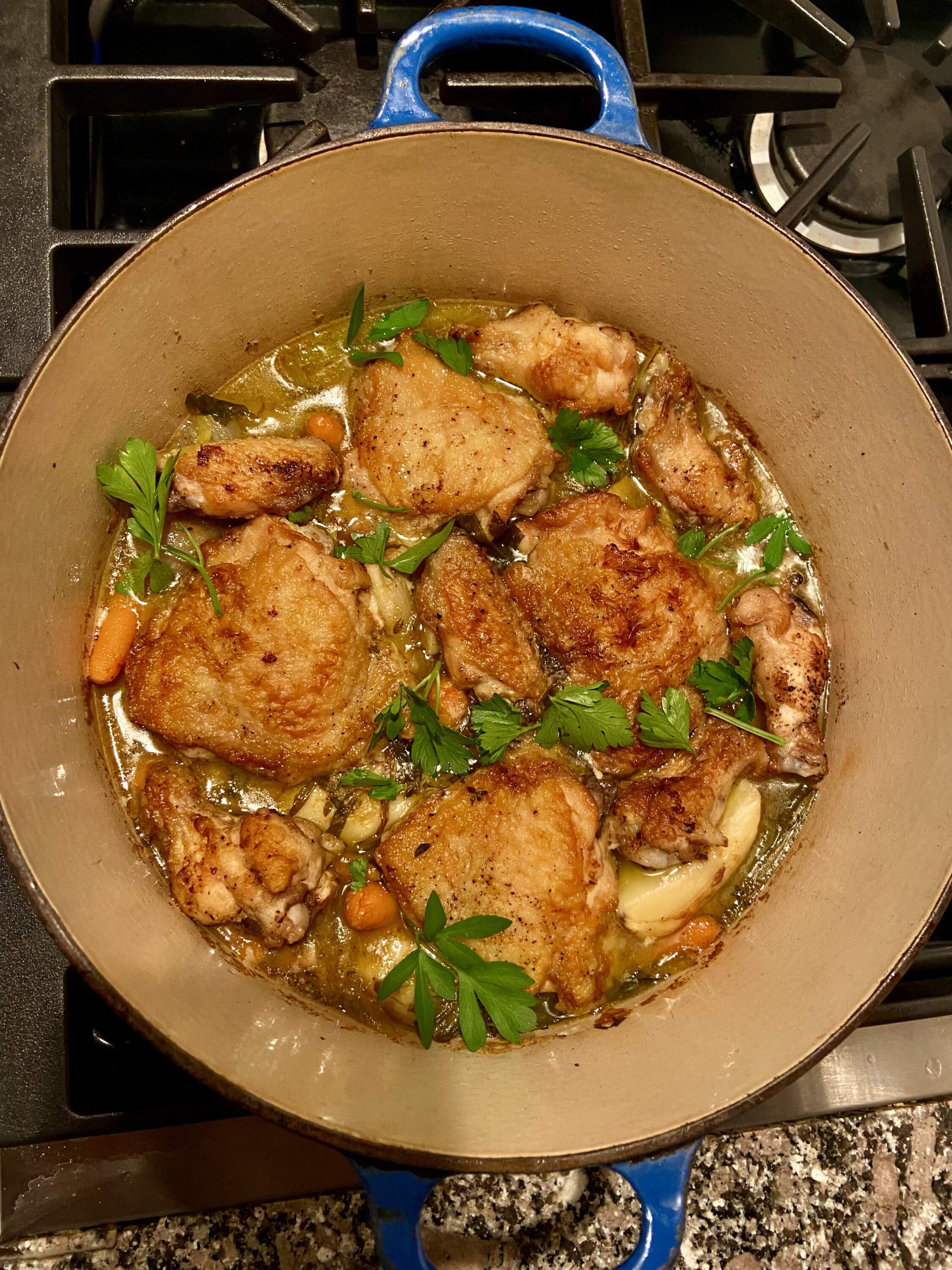 - Add the remaining 1 tablespoon oil and the butter to the casserole and place over low heat. Add the leeks, scallions, onions and garlic and cook, stirring, for 5 minutes. Add the potatoes and the carrots, the thyme and half the parsley and cook, stirring frequently, for 5 minutes. Sprinkle on the 1 ½ tablespoon of flour, stirring it into the mixture and cook for 2 minutes. Increase the heat to high and add the apple cider and wine and bring to a boil. Add the vinegar and reduce the heat to medium-low and add the chicken, tucking it into the sauce and the vegetables with the skin and top of the chicken exposed (and not covered by the sauce). Season with salt and pepper. Cover partially and cook for about 1 hour, or until the chicken and potatoes are tender. Taste for seasoning. Sprinkle with the remaining parsley just before serving.