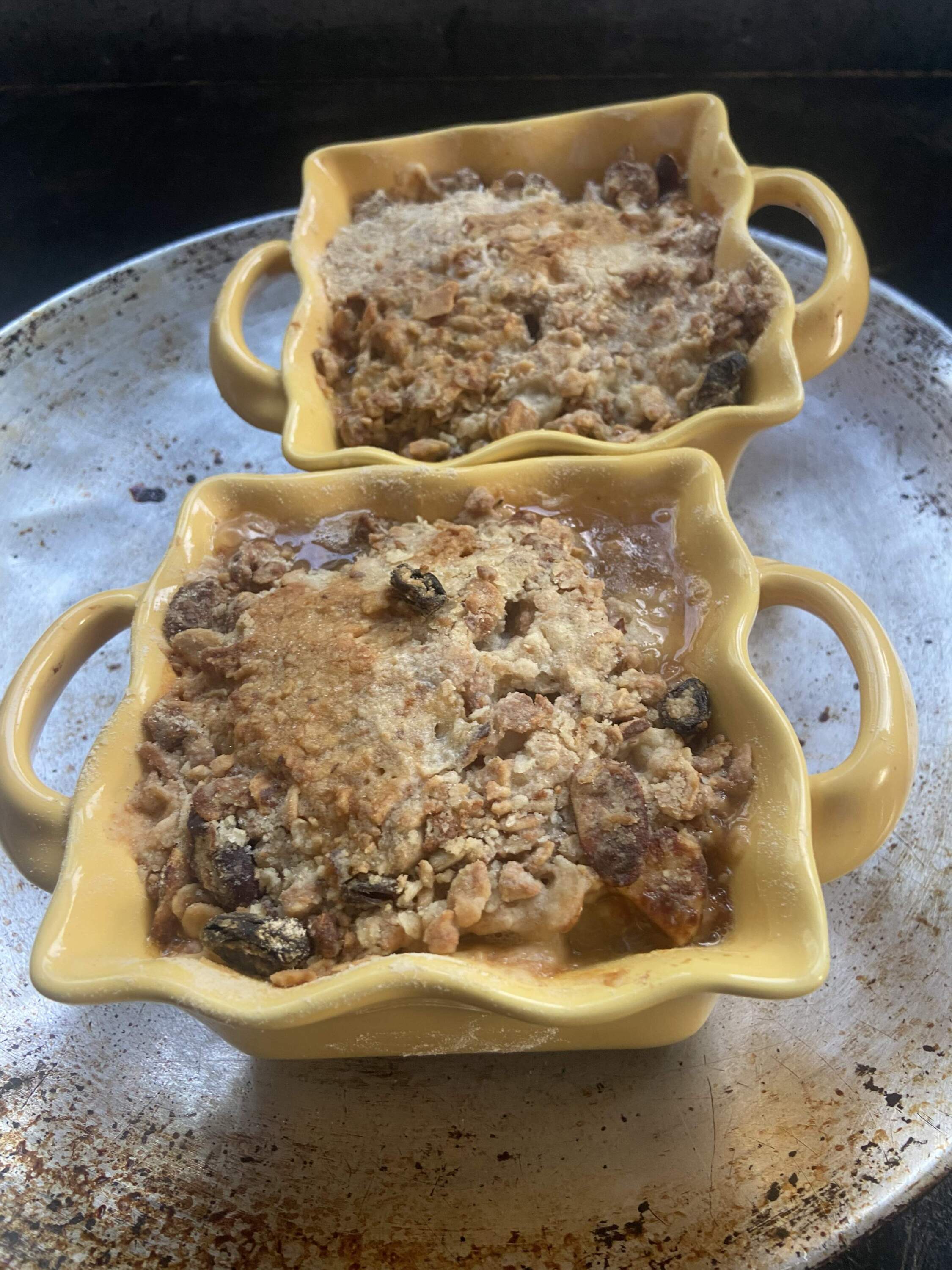 - In a medium bowl, mix the pears, apple, maple syrup, apple cider and cinnamon, ginger and salt. Place in two 2 cup ramekins or a 4 cup medium ovenproof skillet or pyrex dish.